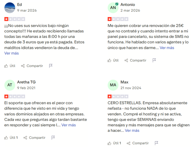 Hostalia es un proveedor veterano en España con centros de datos locales, planes con dominio, SSL y bastante espacio. El problema es que las valoraciones de clientes reales son muy preocupantes: en Trustpilot ronda el 1,3/5 con más de 100 opiniones, donde se acumulan quejas sobre soporte lento, poco resolutivo, bloqueos de recursos, cobros indebidos tras solicitar la baja y políticas confusas.
