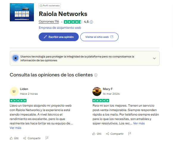 Tiene valoraciones de 4,7/5, destacando soporte rápido en español, buena estabilidad para proyectos de afiliación, blogs y webs corporativas, y una relación calidad-precio que es difícil de ignorar. En Trustpilot se leen opiniones que hablan de «trato inmediato y resolutivo» y tiempos de respuesta muy cortos.